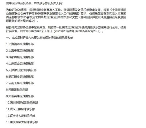 根据中足联公示的名单,总共有41家俱乐部完成了2025赛季及之前所有足球行业内的欠薪和欠款,其中中超方面有13家俱乐部在列,包括上海海港、上海申花、成都蓉城、山东泰山、天津津门虎,浙江队、云南玉昆、河南队、大连英博、深圳新鹏城、武汉三镇、辽宁铁人以及重庆铜梁龙。缺席的3家俱乐部分别是北京国安、青岛西海岸和青岛海牛。